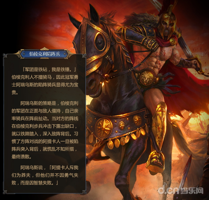 「军团是铁砧,我是铁锤。」伯棱克利人不擅骑马,因此冠军勇士阿瑞乌斯的陷阵骑兵显得尤为宝贵。