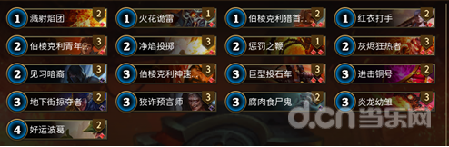 然后是二费生物,【灰烬狂热者】是典型的快攻生物,【见习暗裔】可以用来补到,在前期的随从交换赚场面,让我们更好的铺一波,【伯棱克利青年军】填充曲线是其一,配合波葛是其二。