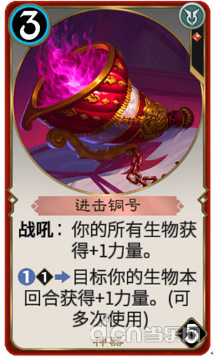 【惩罚之鞭】用来补刀,费用充足的时候打脸补充伤害,但是多了容易卡手,这里只带了一张;【进击铜号】在我们生物铺起来之后做群体的buff也可以buff单个生物做生物交换或者补充伤害,但是这张卡太吃场面,我这里带了两张。