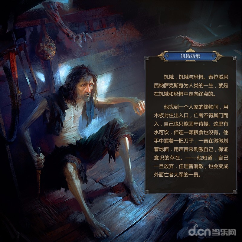 他找到一个人家的储物间,用木板封住出入口,亡者不得其门而入,自己也只能固守待援。这里有水可饮,但连一颗粮食也没有。他手中握着一把刀子,一直在微微划着地面,用声音来刺激自己,保证意识的存在。——他知道,自己一旦放弃,任理智消散,也会变成外面亡者大军的一员。