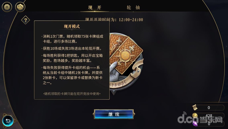 *消耗1次门票(或600金币),随机领取75张卡牌组成卡组,进行多场比赛。