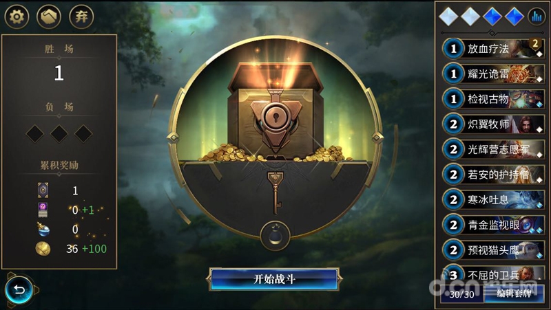 1胜时玩家可以打开木宝箱,获得少量金币、随机卡牌。