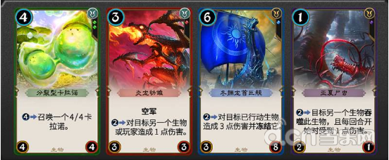 附加型技能的卡牌更是多种多样。红色3费【炎龙幼雏】的技能是补刀神技,绿色4费【分裂型卡拉诺】的技能则完美诠释了绿色卡牌成长的特点,一旦运用得当,对手就将被茫茫多的卡拉诺海洋所淹没。