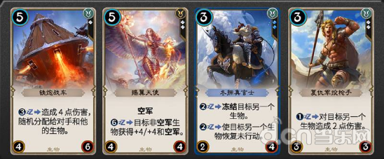 我们先来看行动型技能的两张代表卡牌(技能说明里有zZ图标)。白色3费的【复仇军投枪手】,他在上场后的未行动回合可以通过消耗1水晶,对目标另有一个生物造成2点伤害。由于是技能攻击,该生物并不会受到目标生物的反击。这张牌是是前中期赚取卡差,获得占场优势的利器。处于平衡型考虑,【复仇军投枪手】在使用该技能后就会变为已行动,不能再次攻击。