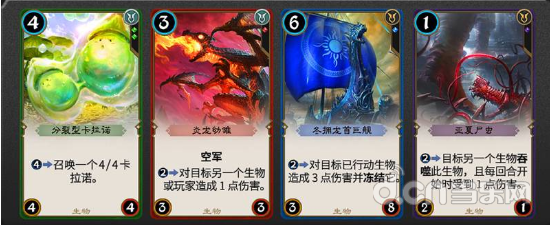 附加型技能的卡牌更是多种多样。红色3费【炎龙幼雏】的技能是补刀神技,绿色4费【分裂型卡拉诺】的技能则完美诠释了绿色卡牌成长的特点,一旦运用得当,对手就将被茫茫多的卡拉诺海洋所淹没。