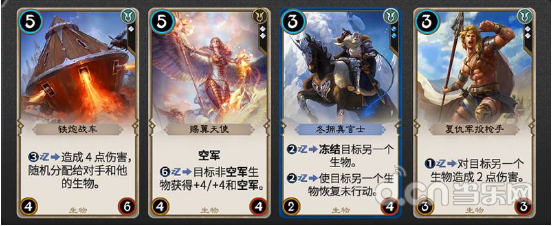 我们先来看行动型技能的两张代表卡牌(技能说明里有zZ图标)。白色3费的【复仇军投枪手】,他在上场后的未行动回合可以通过消耗1水晶,对目标另有一个生物造成2点伤害。由于是技能攻击,该生物并不会受到目标生物的反击。这张牌是是前中期赚取卡差,获得占场优势的利器。处于平衡型考虑,【复仇军投枪手】在使用该技能后就会变为已行动,不能再次攻击。