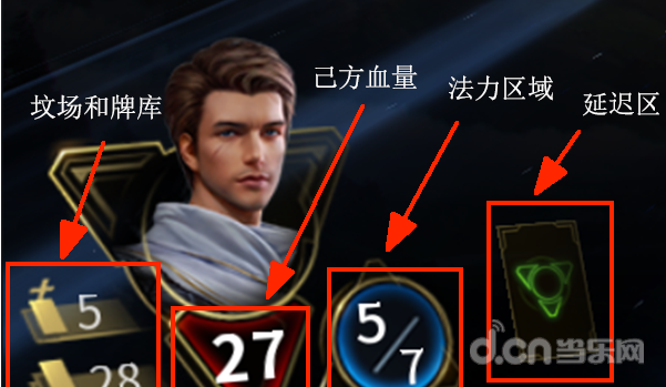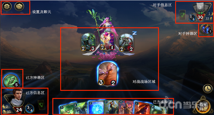 整个游戏界面可以大致分为上中下三部分。对手形象和信息都在游戏界面的上半部分;中间区域为对战区域,生物的攻防都在这里进行;下方是己方手牌和信息区域,信息在整个屏幕的左下角,包含玩家的生命值,法力值,坟场和牌库等。如下图所示: