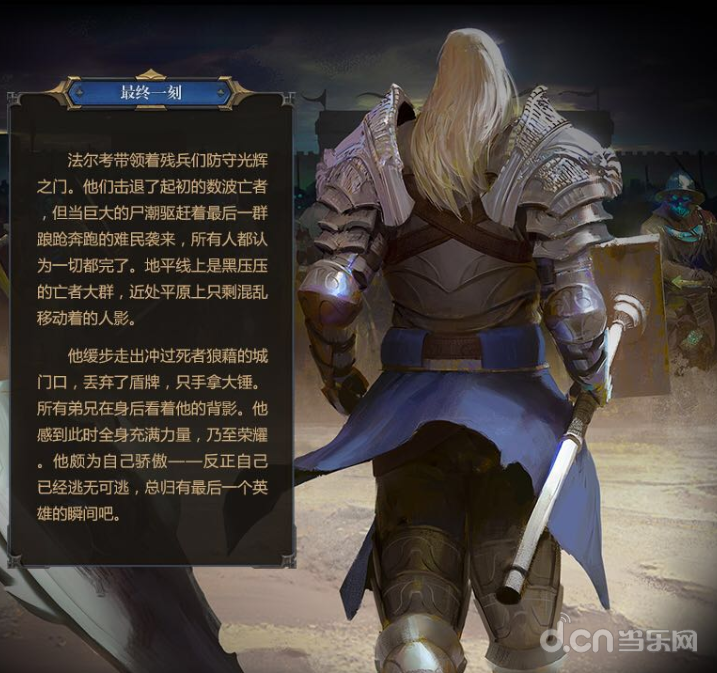 法尔考带领着残兵们防守光辉之门。他们击退了起初的数波亡者,但当巨大的尸潮驱赶着最后一群踉跄奔跑的难民袭来,所有人都认为一切都完了。地平线上是黑压压的亡者大群,近处平原上只剩混乱移动着的人影。