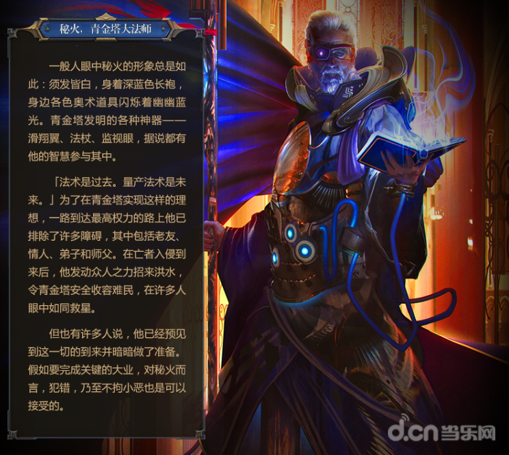 一般人眼中秘火的形象总是如此:须发皆白,身着深蓝色长袍,身边各色奥术道具闪烁着幽幽蓝光。青金塔发明的各种神器——滑翔翼、法杖、监视眼,据说都有他的智慧参与其中。
