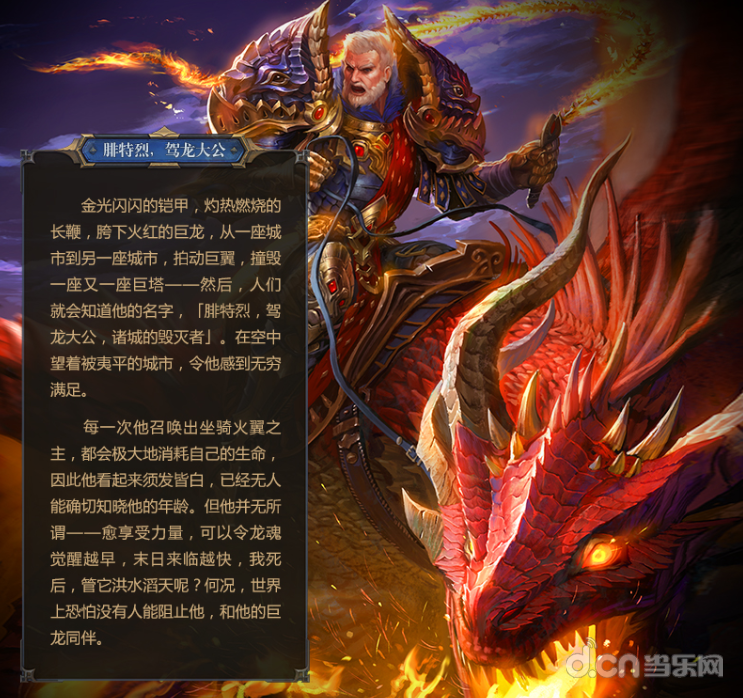 每一次他召唤出坐骑火翼之主,都会极大地消耗自己的生命,因此他看起来须发皆白,已经无人能确切知晓他的年龄。但他并无所谓——愈享受力量,可以令龙魂觉醒越早,末日来临越快,我死后,管它洪水滔天呢?何况,世界上恐怕没有人能阻止他,和他的巨龙同伴。