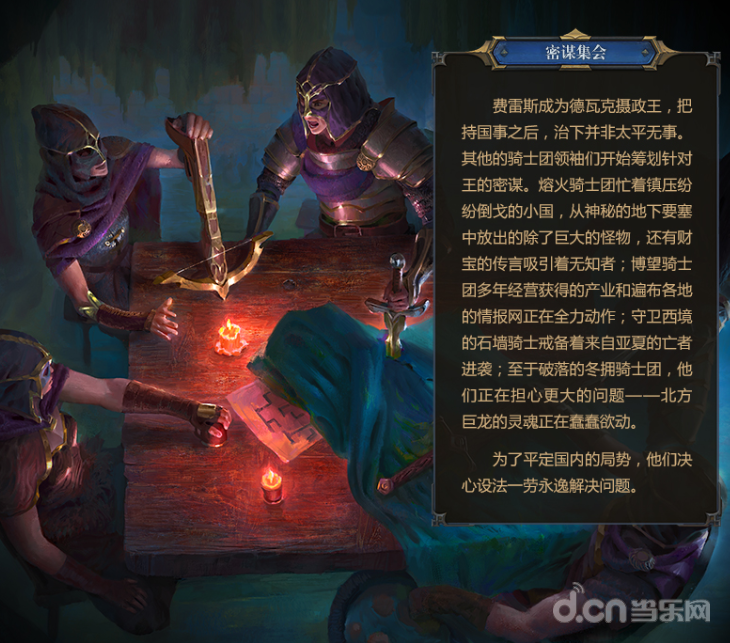 费雷斯成为德瓦克摄政王,把持国事之后,治下并非太平无事。其他的骑士团领袖们开始筹划针对王的密谋。熔火骑士团忙着镇压纷纷倒戈的小国,从神秘的地下要塞中放出的除了巨大的怪物,还有财宝的传言吸引着无知者;博望骑士团多年经营获得的产业和遍布各地的情报网正在全力动作;守卫西境的石墙骑士戒备着来自亚夏的亡者进袭;至于破落的冬拥骑士团,他们正在担心更大的问题——北方巨龙的灵魂正在蠢蠢欲动。