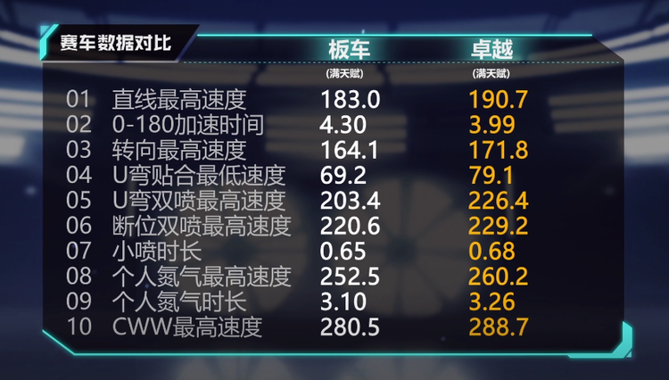 卓越的转向灵活性和抓地力在B车中最为出色非常擅长弯道较多,需要考验玩家漂移操作功底的赛道。需要注意的是卓越的加速能力稍显不足,在加速带较多的地图里略显乏力,需要熟练的技巧才能最终取胜。