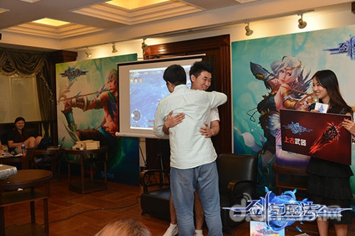 在见面会现场,有一幕不得不提起,那就是我们“剑魔”汉子们的基情抱抱了!相比是一直和基友们在游戏中玩抱抱,在现实的三次元这还是第一次!所以玩比较嗨,抱的也比较紧!通过这次踩报纸的游戏,我们“剑魔”的男勇士们完成了现实版“情缘任务”,也因此而获得了稀有奖励!