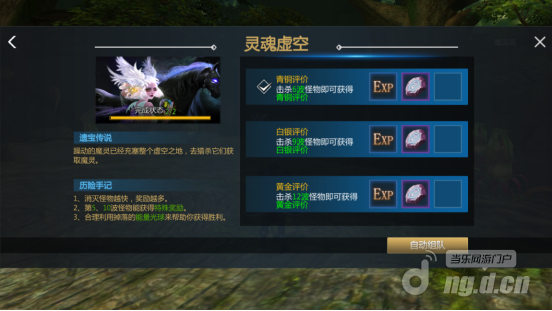 通过进入活动任务中的灵魂虚空,通过击杀空旷的虚空之地中出现的数波强力怪物可以获得魔灵和坐骑的强化道具以及经验,击杀怪物波数越多,获得的评价越高,击杀怪物越快,奖励越多。