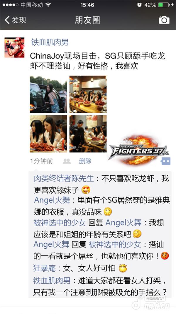 八神“互撸队”携手闯荡江湖,雅典娜未卸妆狂啃小龙虾,异国不知火舞“带球过人”,秒得宅男鼻血横流……今年的ChinaJoy有许多让人印象深刻的拳皇元素,《拳皇97OL》的格斗家们也没闲着,继续在朋友圈欢脱吐槽。看完他们的混乱互动,相信大家也将报以会心一笑。