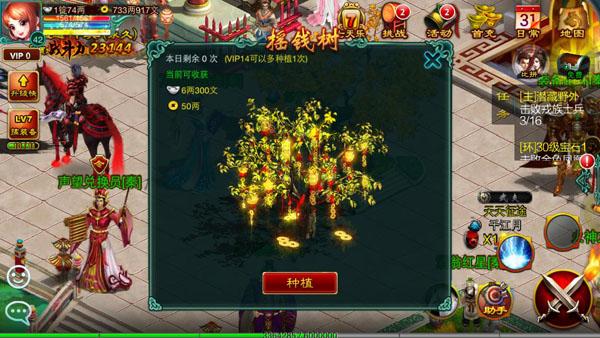 摇钱树顾名思义就是拿钱的,玩家每天可从摇钱树系统中获得一笔稳定银子和铜钱收入。玩家在摇钱树牌匾处点击可每天种植3次,每次种植成功后需要等待30分钟方能进行收获,收获时可获得大量银子和铜钱。摇钱树除了能种还能摘,每过一段时间会长出一些铜钱,玩家只要站在摇钱树下,点击树上生长的铜钱便可获得少量铜钱。