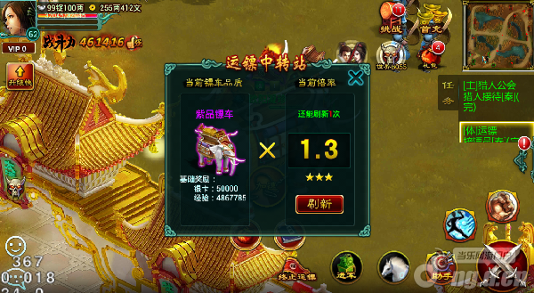 接取镖车后,拥有免费刷新一次镖车品质的机会,很可能一次就变成紫色镖车了哦。如果没有获得紫色镖车,想要碰碰运气的话,可以消耗50两刷新镖车品质哦。