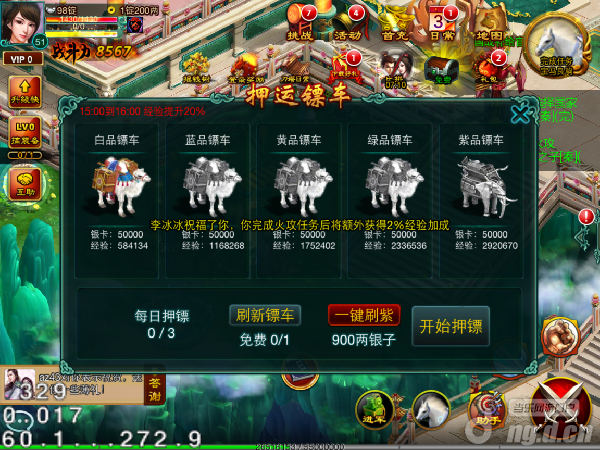 顺利到达终点,海量经验拿到你爽。每天3次运镖机会千万别错过啊。