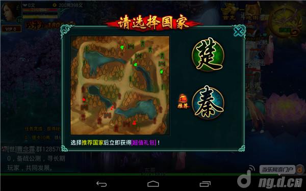 首先,进入《征途》手游后要你选择自己的国家。目前是秦国和楚国两种选择。这张地图看上去很像LOL的召唤师峡谷啊~小编跃跃欲试,看到秦国选项旁写着“推荐”,果断选择了楚国(坏笑)!不要问我为什么。
