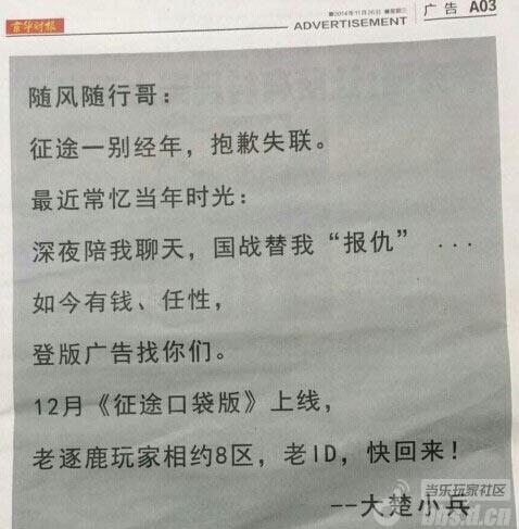 《征途》玩家登报找队友 12月2日共战《征途》手游