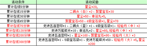 活动内容:活动期间满足一定的在线时间即可领取好礼