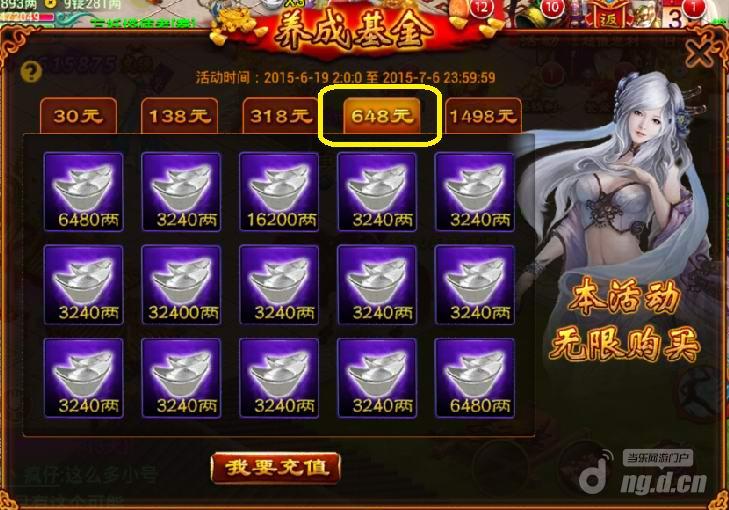 先选中上面648元的标签,下面可以看到连续15次可以领取的银子奖励(总额可是正常充值的三倍哦!)。选好档次后,点下面的“我要充值”,会弹出一个新的充值界面: