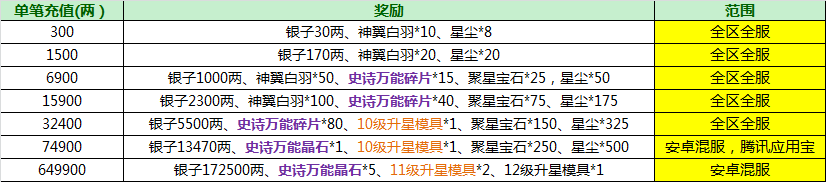 为了让各位大大们有更多的资源储备来迎接新版本,单笔充值返利也全面升级。单笔充值指定金额即可获得神翼,史诗晶石,高级升星模具等等,全方位提升您的作战能力。