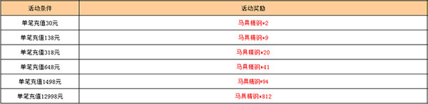 活动期间、单笔充值达到指定金额、即可获得马具精钢(请在活动下架前及时领取活动)