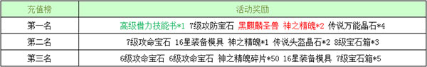 跨服榜强强来袭,跨服充值榜凡玩家获得第一名将获得至尊神圣坐骑-麒麟圣兽,跨服消费榜和战力第一名的玩家可获得九灵元圣。
