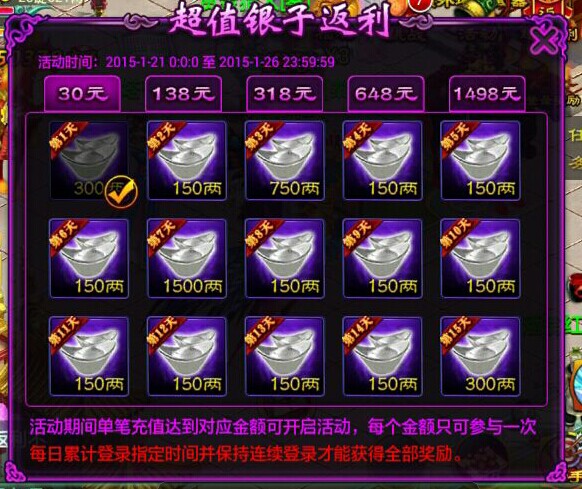 活动内容:活动期间内,单次充值达到对应金额可获得3倍银两。只要天天登录游戏,在线满1分钟,即可领取银两返还。小伙伴们还按捺的住么!了解更多活动详情请登陆游戏进行查看哟!