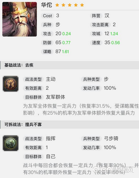 首先从三围说起,0.24的【攻击】和0.77的【防御】都不是很理想,但想到华佗老爷子的一把年纪也可以理解;1.61的【谋略】,加上华佗87的初始【谋略】,这么算下来40级是150+的【谋略】,带谋略技能还算可以;【攻击距离】2,但是考虑到他较低的攻击力和技能特点,攻击距离短倒是问题不大;【速度】0.56很慢,不过这倒是个好事,因为基于伤兵法则,加血技能在一个回合内越晚放越好。