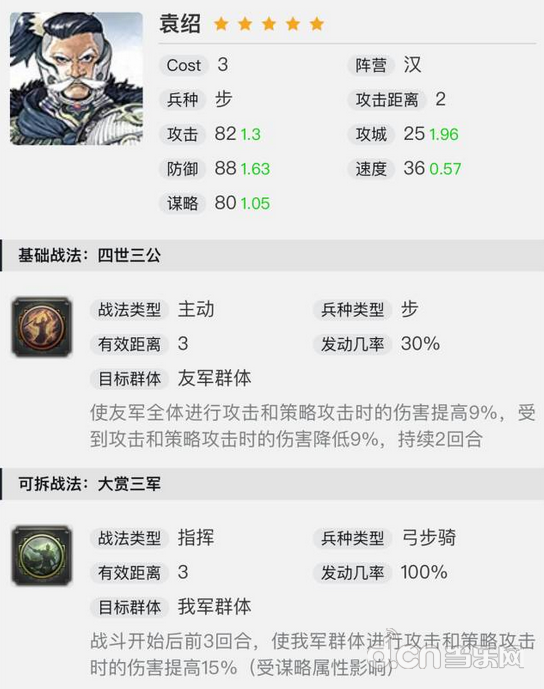 先从三围来说吧,1.3的【攻击】尚可;1.63的【防御】,可以作为前排来使用;1.05的【谋略】不算太高;1.96的【攻城】成长挺不错的,不愧是割据一方的枭雄;【攻击距离】2偏短,不过并没有太大影响,因为袁绍大多也是作为前锋使用的。