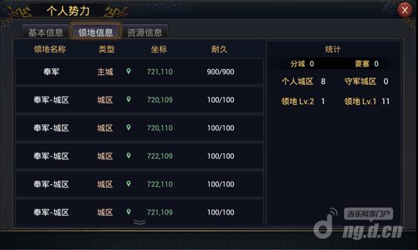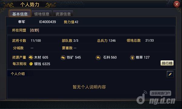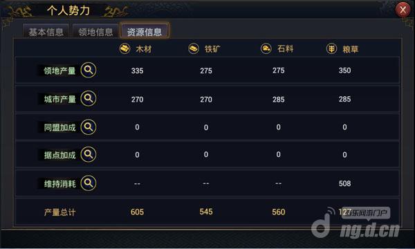 1)在主界面下方主菜单点击右侧上拉箭头,打开“势力”,可查看玩家个人势力信息。个人势力信息包括“基本信息”、“领地信息”、“资源信息”。