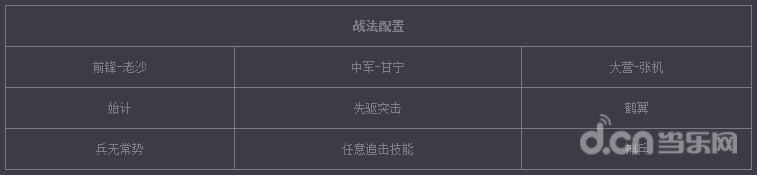 这个配置的思路很简单,保证前两回合的强力输出。张机大营是避免弱智将被法师秒的尴尬局面,且张机在任意位置其作用都差不多。老沙带始计,免控,自身技能有一定输出且能控制对方大营,且在鹤翼的辅助下,输出也是可观的。甘宁的作用就不多赘述。