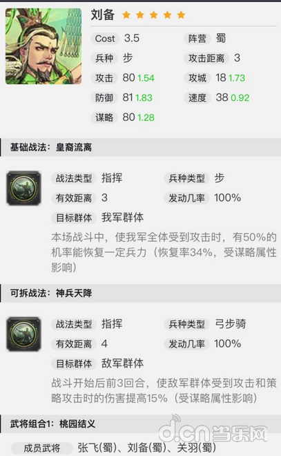 推荐战法:“避其锋芒”、“大赏三军”、“白刃”等等,根据队伍情况带辅助技能即可。另外刘备不太需要“战必断金”这样的强控,因为减伤就足够达到类似的效果了。
