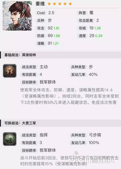 搭配 说完技能我们来说说搭配,由于姜维的三围限制,无法担当大营输出,而技能本身偏辅助且没有范围限制,因此前锋或者中军都是可以的。由于技能受谋略影响,一般情况下加点还是会选择全谋略。由于新版姜维的生存与输出都还不错,而刘备又无法存在于多个队伍,所以姜维可以作为蜀步的辅助,来填补相应的空缺。