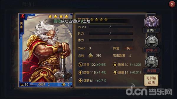 黄盖,吴国四星将里最容易满红星的武将,因为铜钱包就能出,属于控制型前排肉盾,主技能苦肉计,单体混乱两回合的追击技,算是很强力的单体控制技了。技能上可以考虑带连战,运气好,一回合就可以控住2个目标,不过因为是步兵,速度太慢,如果想要保证先手率,队伍需要带长驱直入。