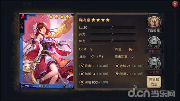 主技能碟舞红莲,策略输出+群体恢复,发动率还不错。非常适合前期过渡。。满红星的大乔在后期战斗力也不错~