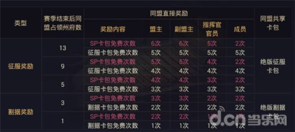 赛季结算时,根据所在同盟占领的州府(含国都)数量,决定所获得的赛季城池奖励。奖励包含SP卡包免费次数、绝版征服卡包免费次数等丰厚奖励,奖励将在赛季切换完毕后直接发放到玩家的角色账号中。具体规则如下: