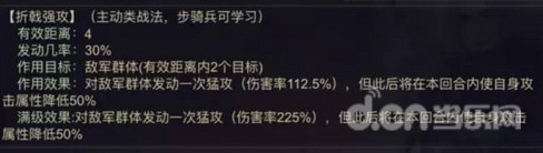 伤害率、作用目标和发动几率是输出战法判断收益的核心依据,通过这三者的计算可以得出期望伤害率,以【折戟强攻】为例: