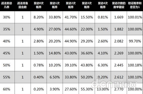 在这里不以具体战法为例,而是以发动几率为例,玩家可根据战法的发动几率到表格中自行对比。例如,【一骑当千】的发动几率为30%,那么【一骑当千】在八回合中发动次数的数学期望就在第一栏,数据为1.669。