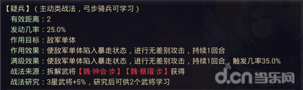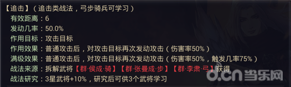 看到满级效果是不是惊呆了,还降低敌方单体双攻45!伤害209%也算非常不错的了,何况发动几率也不低,绝对是实用的四星战法。