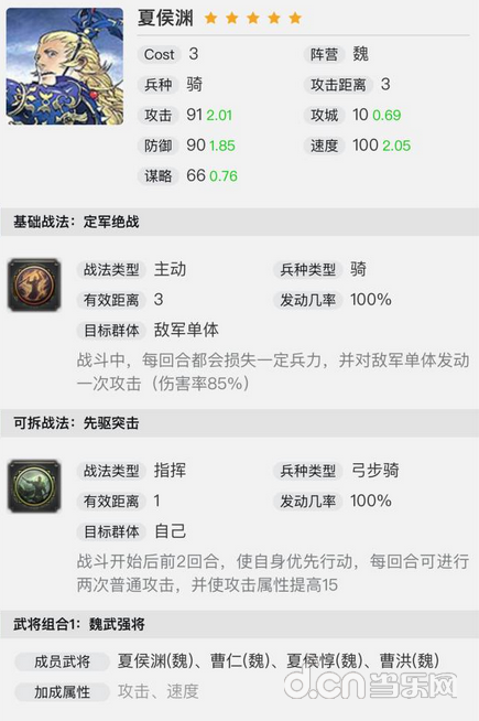 三围来说,2.0的【攻击】成长在众多猛将中只能说一般,够用但不突出;1.85的【防御】说明物理伤害的抗性不错;0.76的【谋略】稍低,法系伤害打出来还是挺痛的;高达2.0的【速度】,除了张辽以外的队伍基本夏侯渊都是第一个出手的;而3的【攻击距离】则给了这个武将相当大的位置自由空间。