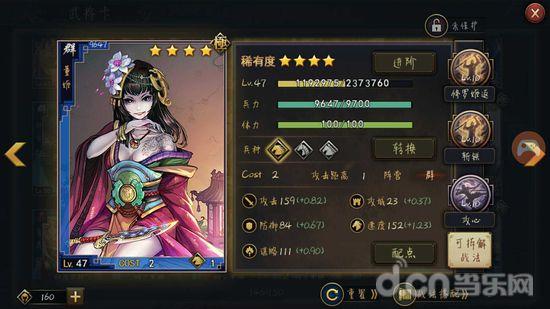 董姬2的cost百搭无压力,技能升满是35%的几率触发,75%的几率使敌人不能普攻,并且放技能时动摇(和贾诩的那个差不多),非常不错的技能!
