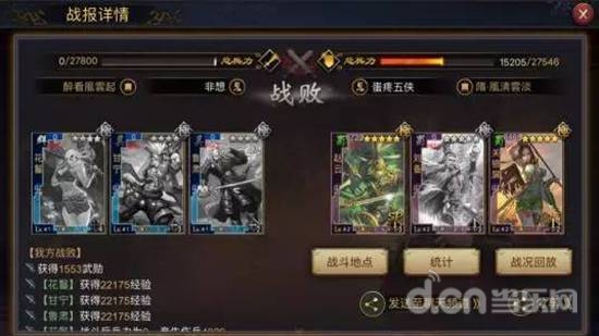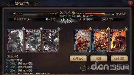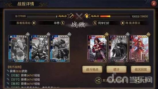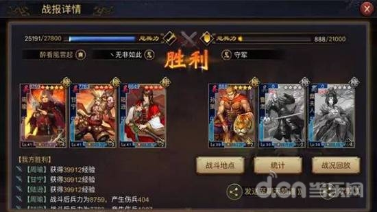最后,考虑一些在队伍搭配中的细节,例如甘宁战法与大赏三军冲突,带鱼鳞的队伍千万不要带主动战法等。一队相对配置较低,而强度很高的队伍就出炉了。在此附上几封我的低配队伍刷城皮和跟人打的战报: