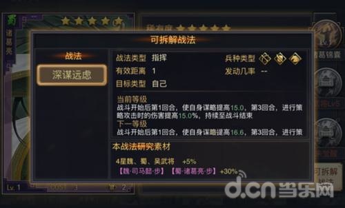 【研究】想要将新获得的技能带上战场还缺关键一步,每个技能初拆出来都只有10%的研究进度,需要对应这些战法技能,消耗不同的材料武将,才能将之研究成功。虽然有些复杂,不过在研究进度上还是有着些许自由度的,比如研究【深谋远虑】可以选择消耗3个诸葛亮,或者18个4星武将,或者综合起来填充进度。另外每个战法都有着配备数量限制,比如某些强力战法最多只能同时搭配给2个武将。