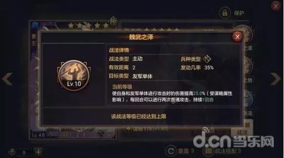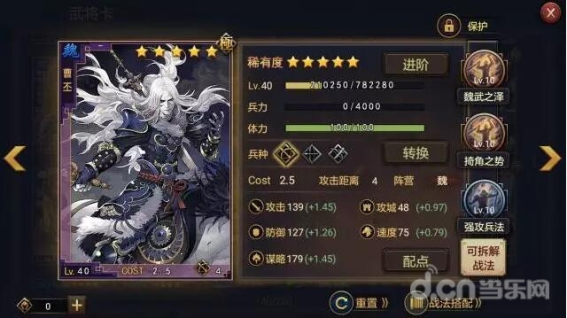 首先揭秘的是如何平衡曹丕谋略和攻击的问题,因为曹丕本身的属性不出众,而这里我们更多的看重他的辅助能力,因此主加谋略是必然的。之后我们可以选择给曹丕带上百战精兵这样的加属性战法,但是出于发展性考虑,图中的强攻兵法是个更好的选择。虽然40级的时候强攻兵法能提供的输出方面加成和百战精兵大致差不多,但它的提升是可以随着等级、星级的增长而变多的,因此是一个不错的选择。