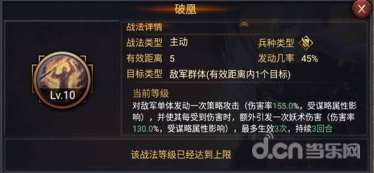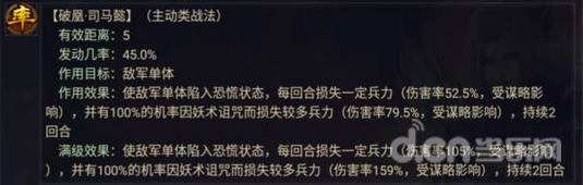 对敌军单体发动一次策略攻击(这里是纯伤害 ,不是状态伤害),然后这个敌军在接下来的三回合内每受到伤害都会额外引发一次妖术(状态伤害)伤害,这个伤害最多生效3次。