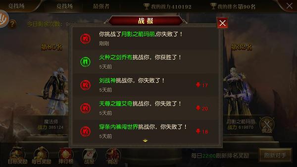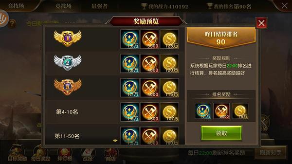 除了挑战完会有声望,竞技场每日晚上22:00会根据当前排名来进行结算,排名越高奖励越多。