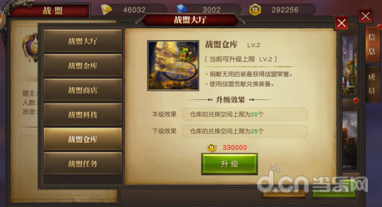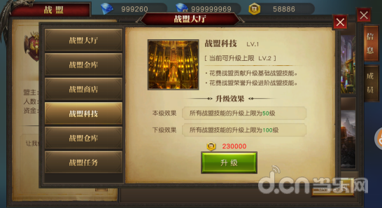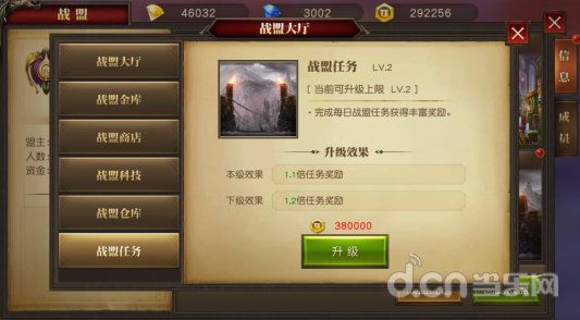 升级效果:提升战盟任务的等级,可以增加获取的任务奖励。
